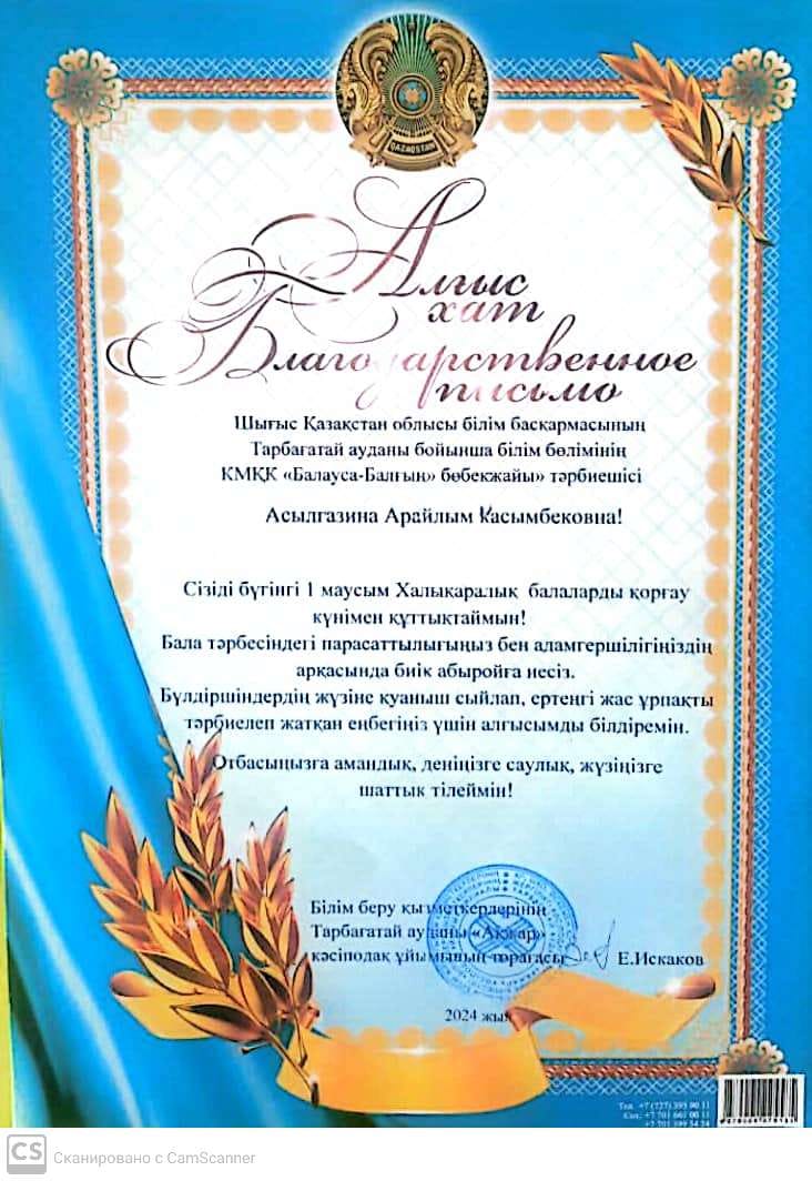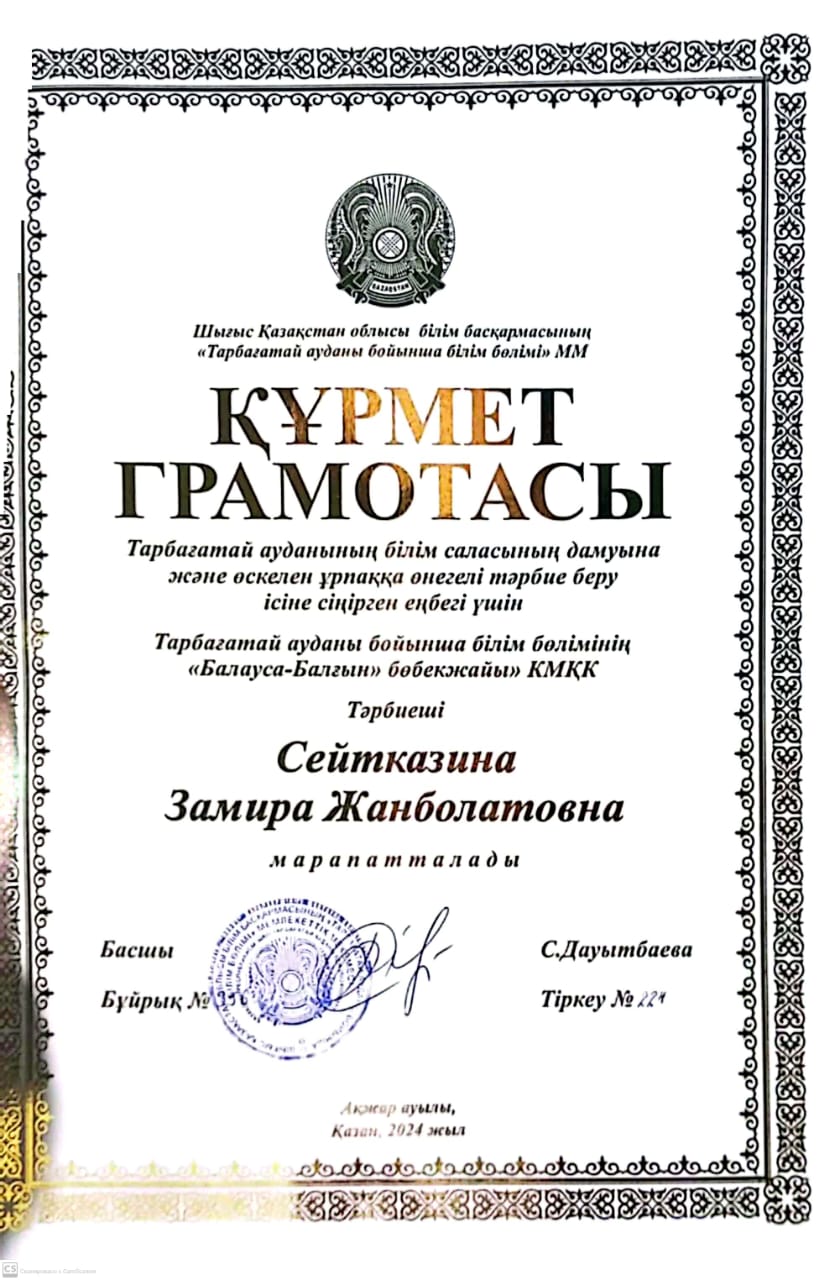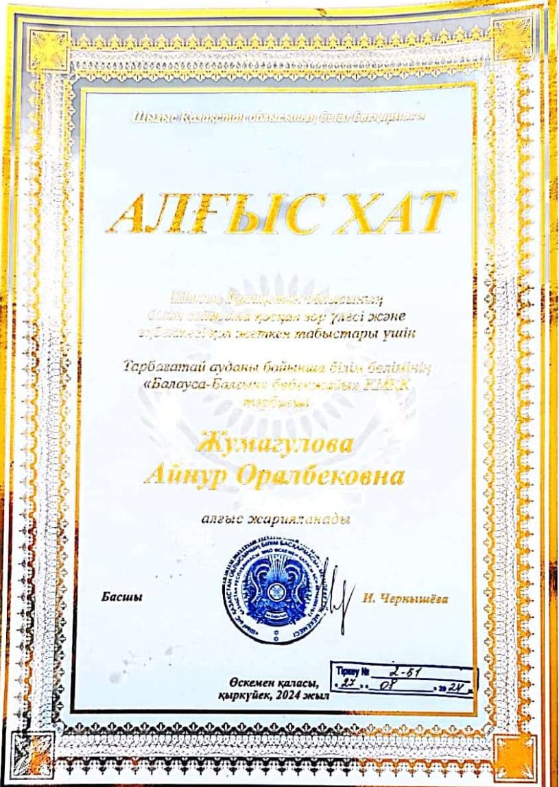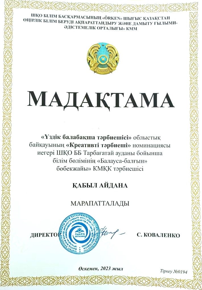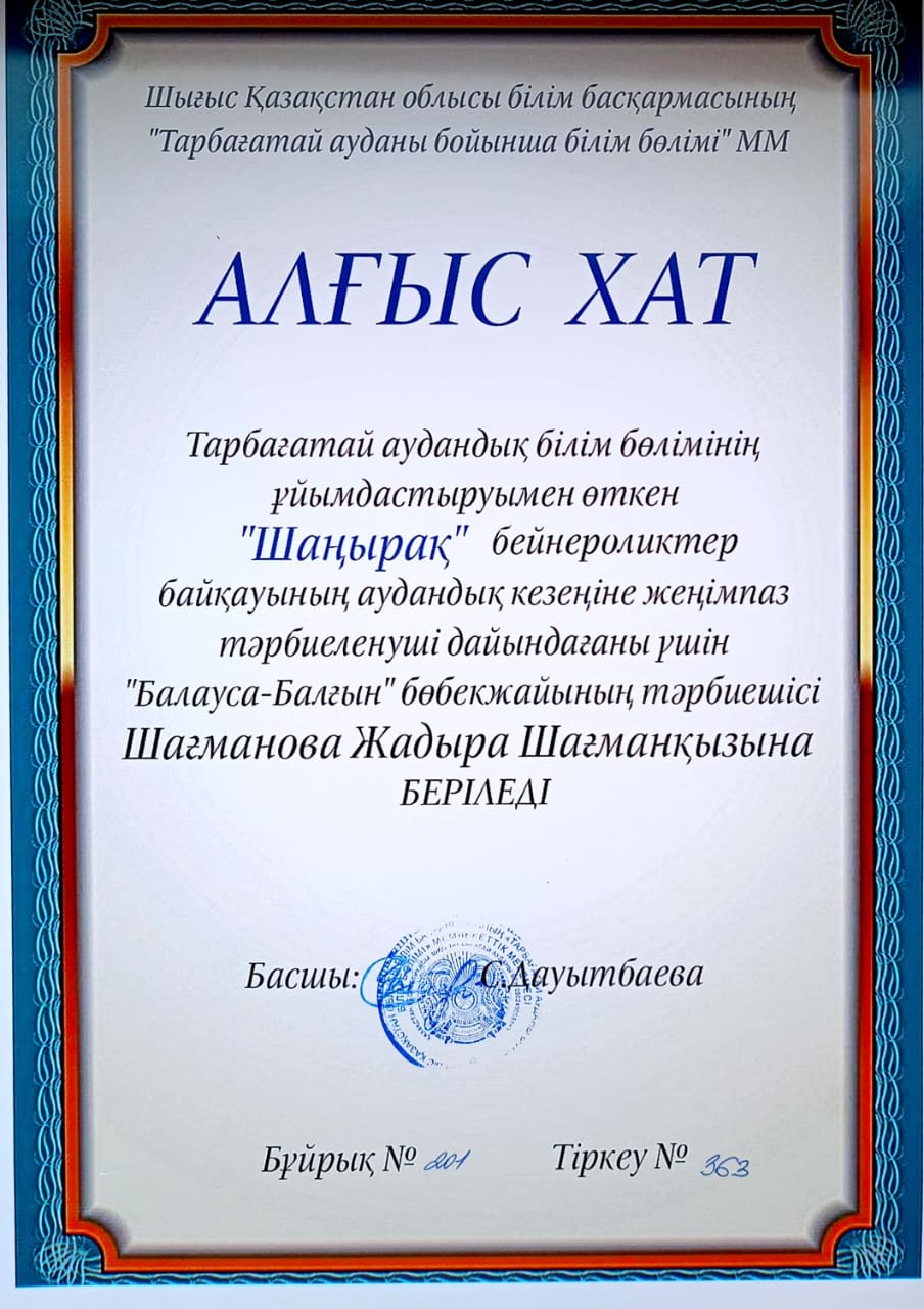 Шағманова Жадыра Шағманқызы Республикалық «Мен зерттеушімін» кезеңіне белсене қатысып, жеңімпаз дайындағаны үшін ШҚО білім басқармасының «Orken» Шығыс Қазақстан өңірлік білім беруді ақпараттандыру және дамыту ғылыми-әдістемелік орталығы» КММ-нің директоры С.Коваленконың алғыс хат....