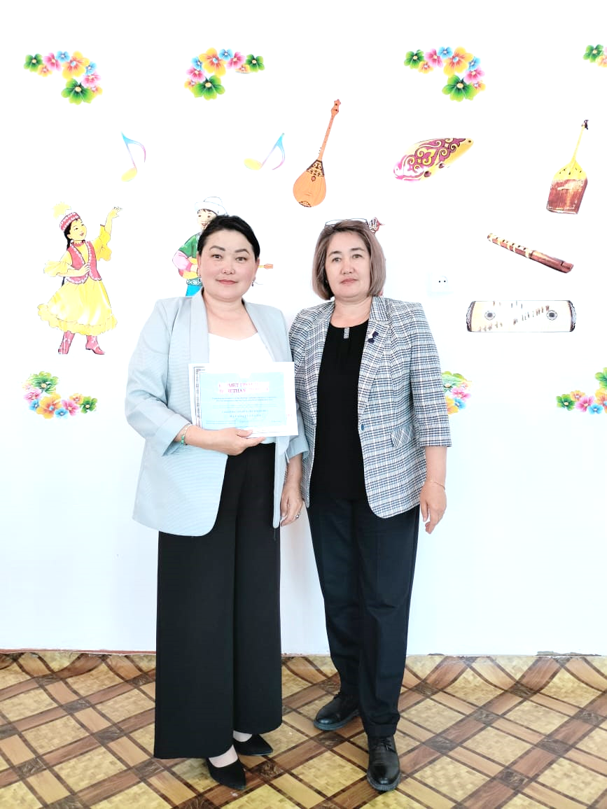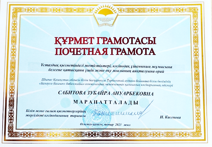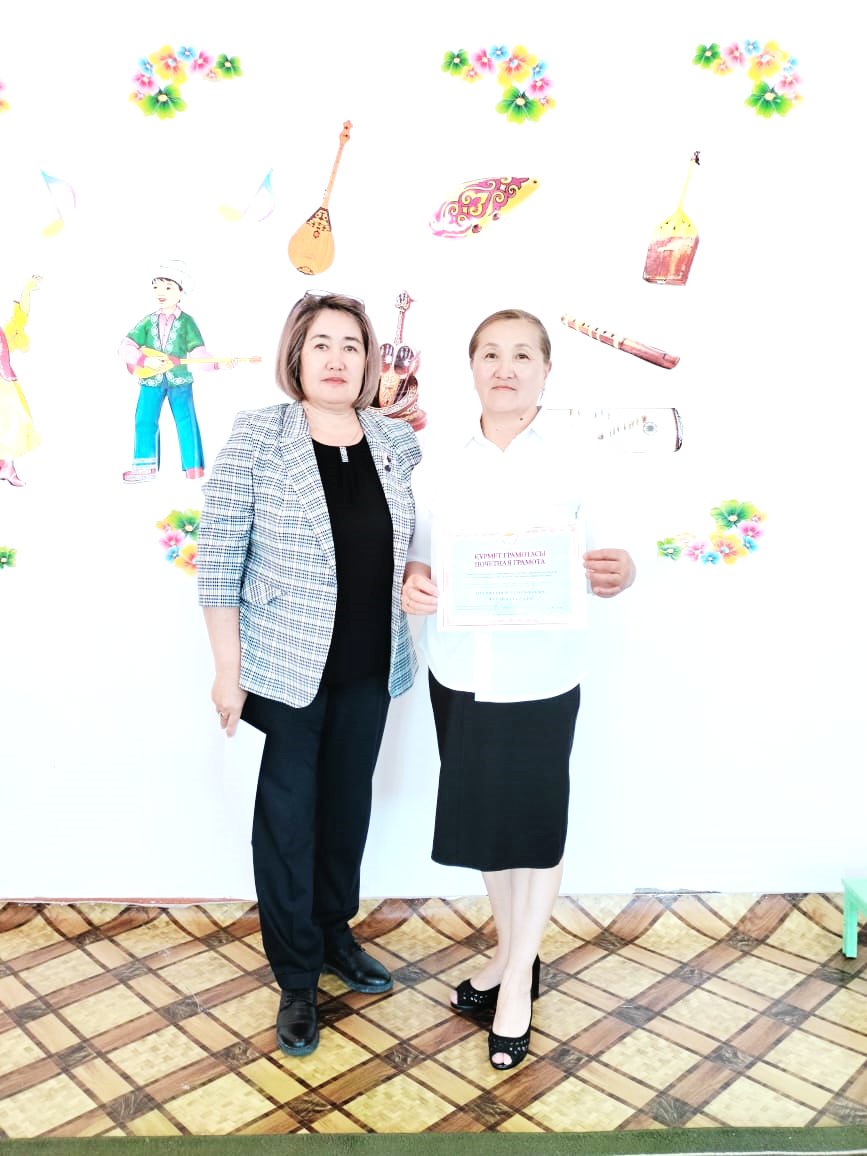 Ұстаздық қызметіндегі жетістіктері, кәсіподақ ұйымының жұмысына белсене қатысқаны үшін және оқу жылының аяқталуына орай Шығыс Қазақстан облысы білім басқармасы Тарбағатай ауданы бойынша білім бөлімінің «Балалауса - Балғын» бөбекжайы» коммуналдық мемлекеттік қазыналық кәсіпорынның әдіскері Сабитова Зубайра Ануарбековна және музыка жетекшісі Ахметова Аймангул Зарлыкановна марапатталады.