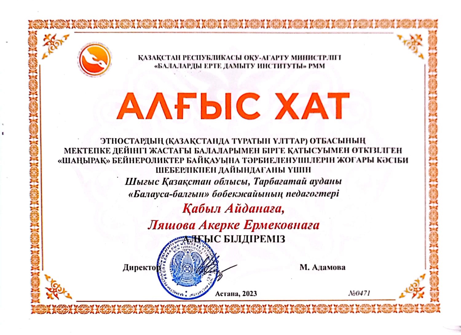 Елекеновнаның алғыс хатымен марапатталды.