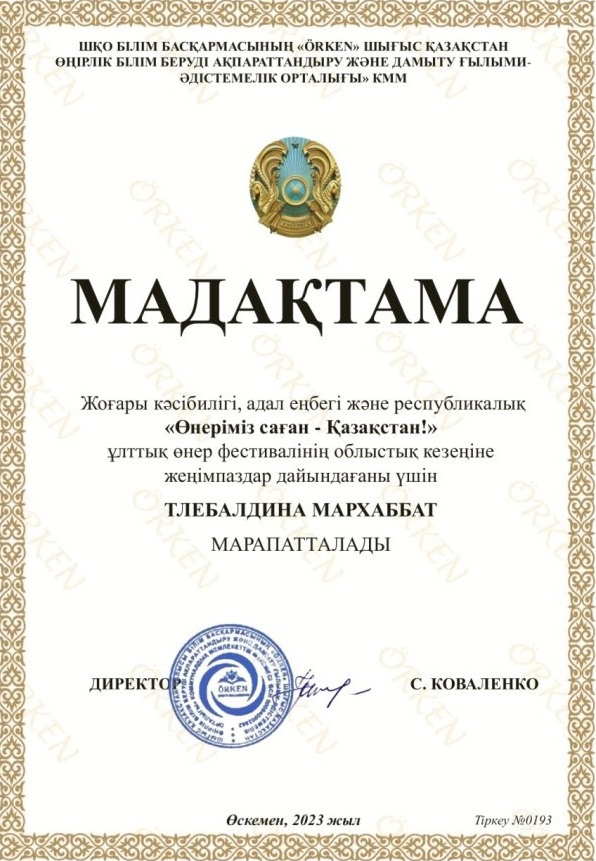 КМҚК «Балауса-Балғын» бөбекжайы» педагогтері Ахметова Аймангул Зарлыкановна, Тлебалдина Мархаббат жоғары кәсібилігі, адал еңбегі және республикалық «Өнерім саған-Қазақстан!» ұлттық өнер фестивалінің облыстық кезеңіне жеңімпаздар дайындағаны үшін ШҚО басқармасының «ORKEN» Шығыс Қазақстан өңірлік білім беруді ақпараттандыру және дамыту ғылыми әдістемелік орталығы» КММ-нің директоры С.Коваленконың мадақтамасымен марапатталды.