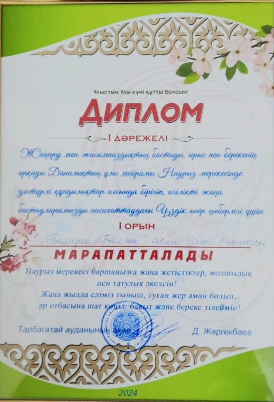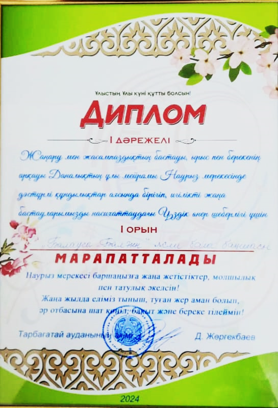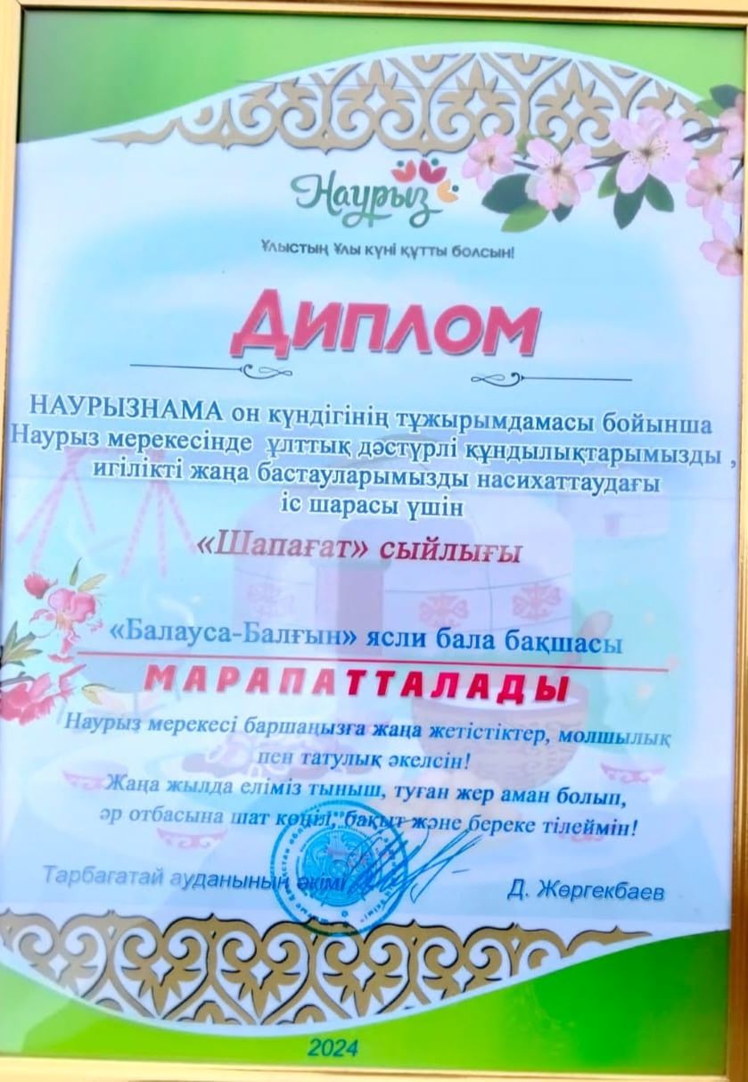 Наурызнама он күндігінің тұжырымдамасы бойынша Наурыз мерекесінде ұлттық дәстүрлі құндылықтарымызды, игілікті жаңа бастауларымызды насихаттауда, үздік өнер шеберлігі үшін КМҚК «Балауса-Балғын» бөбекжайы» ұжымы жүлделі І орынды иеленіп, «Шапағат» сыйлығымен марапатталды.