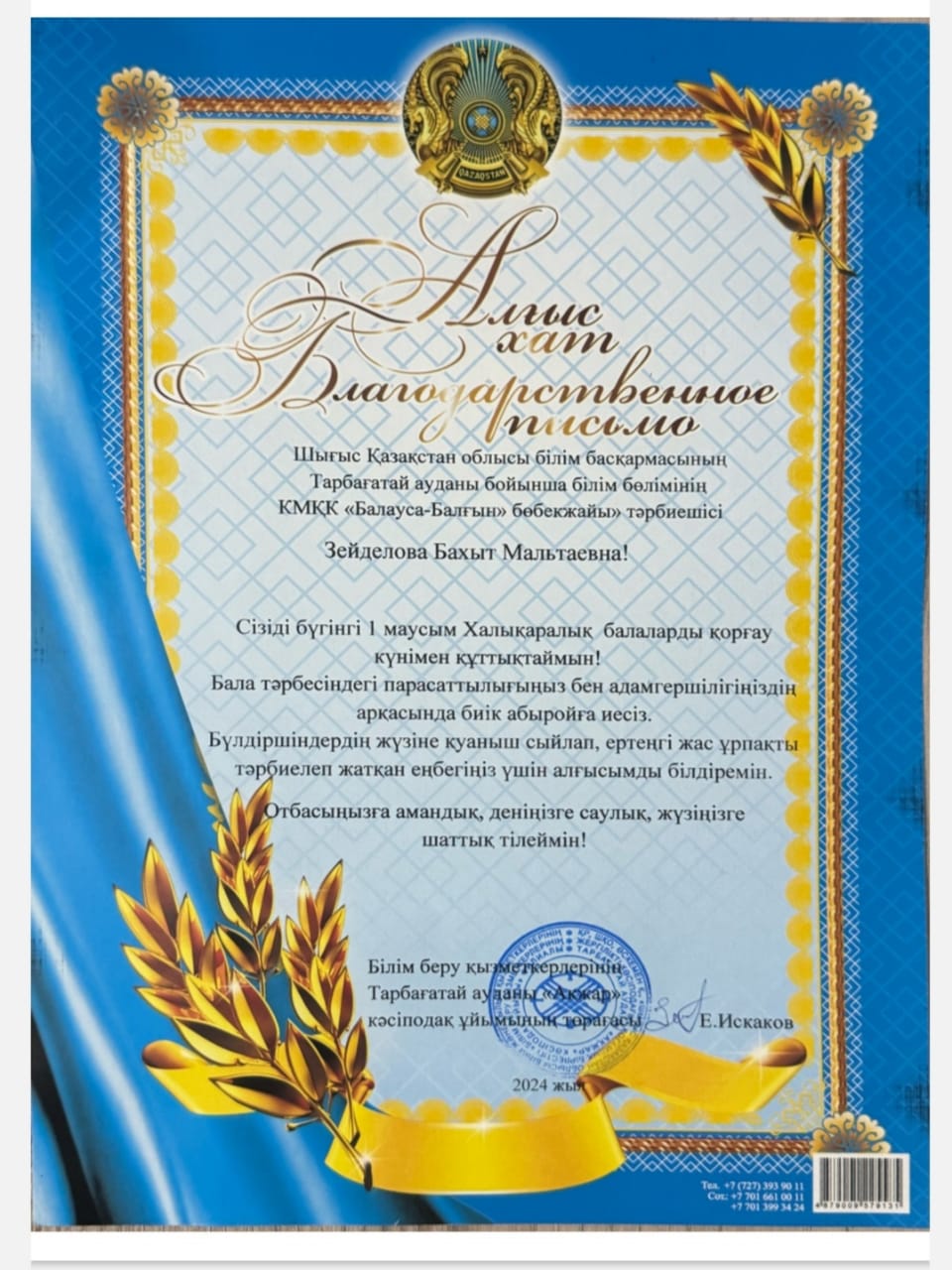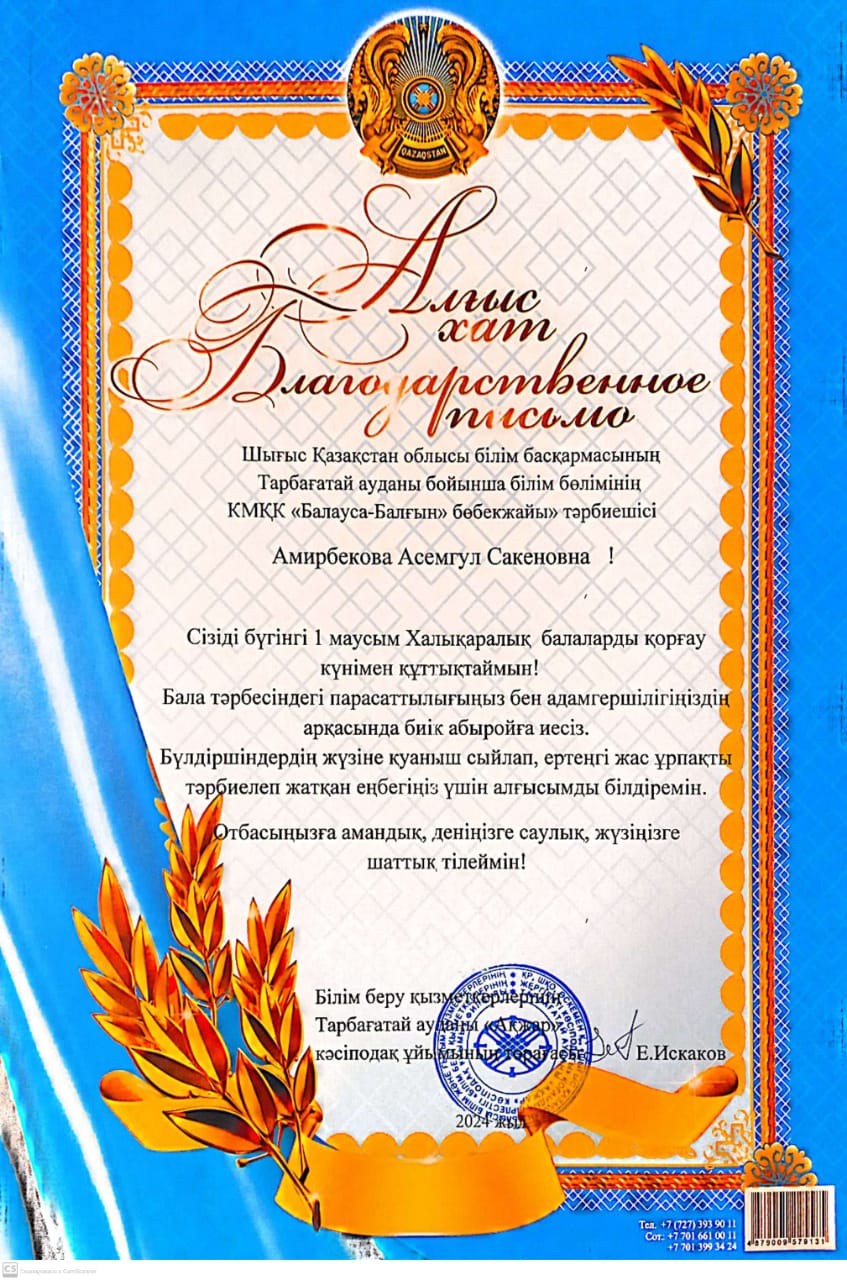 1 маусым Халықаралық балаларды қорғау күні қарсаңында КМҚК «Балауса-Балғын» бөбекжайының тәрбиешілері А.С.Амирбековна, А.К.Асылгазина, Б.М.Зейделова білім беру қызметкерлерінің Тарбағатай ауданы «Ақжар» кәсіподақ ұйымының төрағасы Е.Искаковтың алғыс хатымен марапаттады.