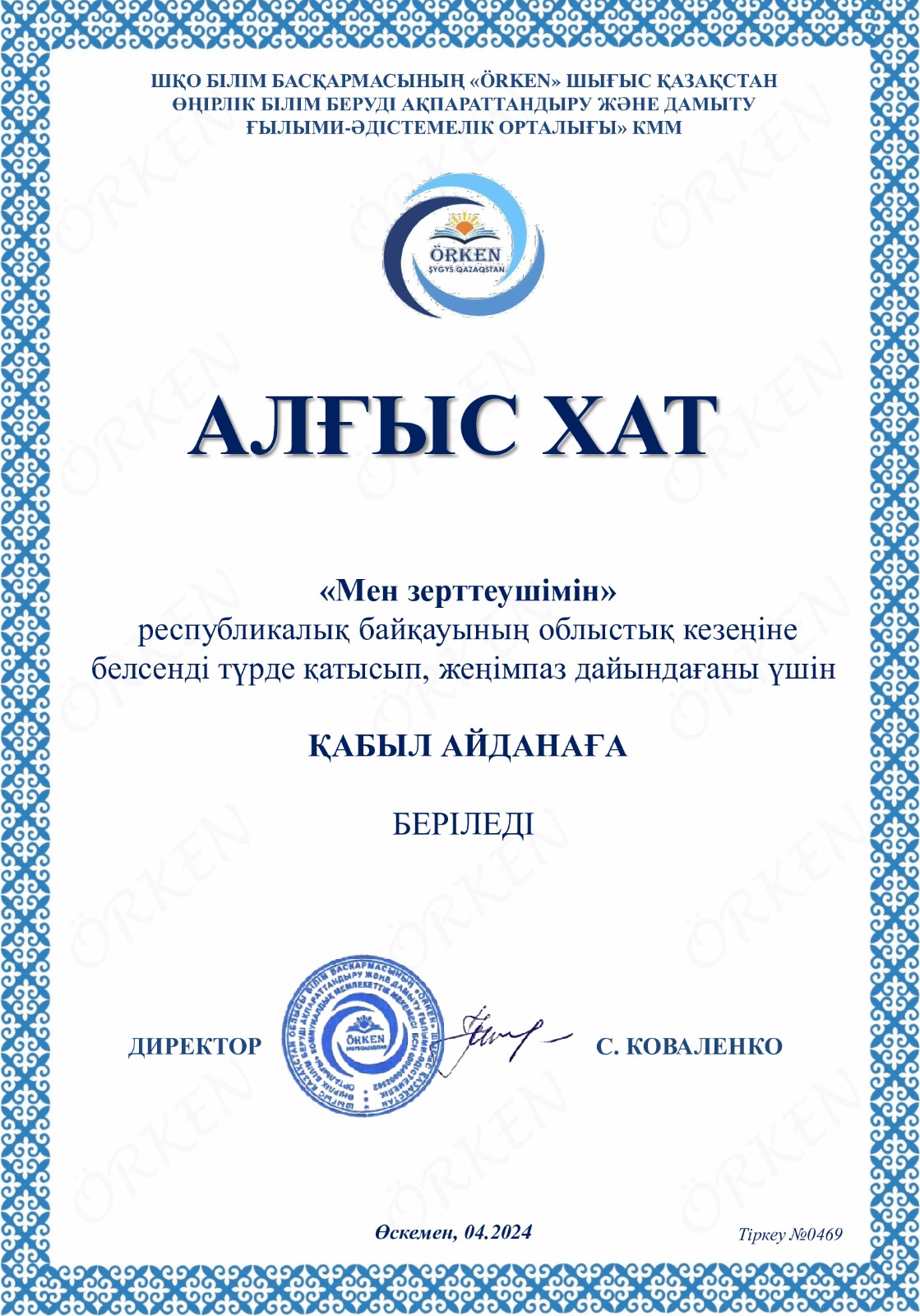 Шағманова Жадыра Шағманқызы Республикалық «Мен зерттеушімін» кезеңіне белсене қатысып, жеңімпаз дайындағаны үшін ШҚО білім басқармасының «Orken» Шығыс Қазақстан өңірлік білім беруді ақпараттандыру және дамыту ғылыми-әдістемелік орталығы» КММ-нің директоры С.Коваленконың алғыс хат.