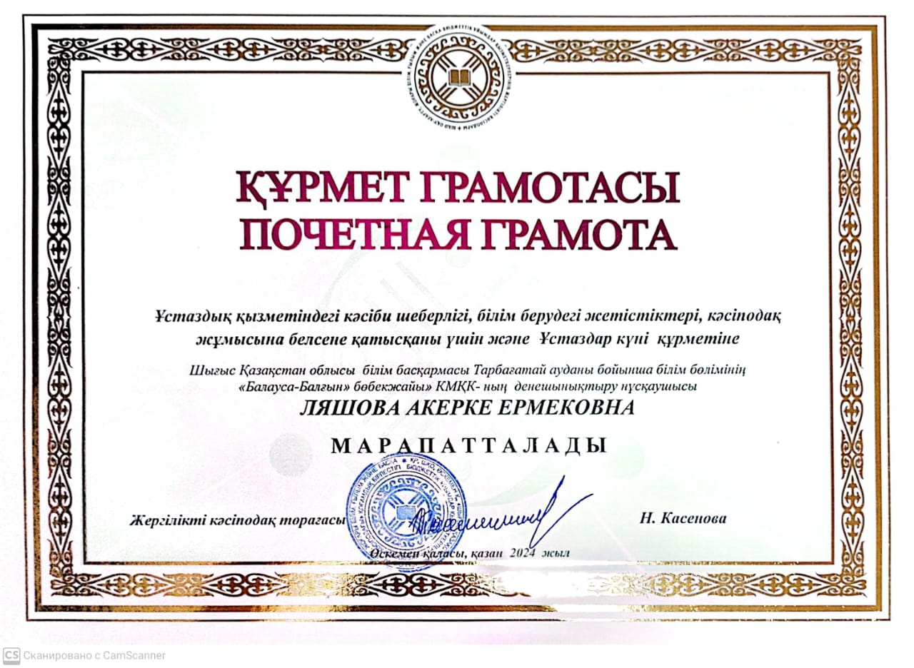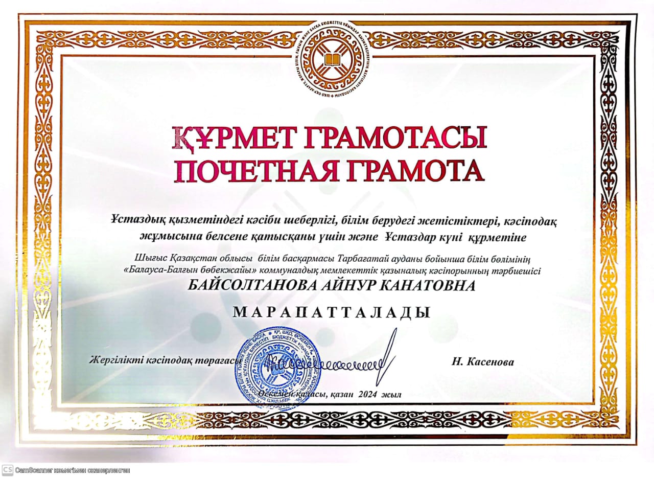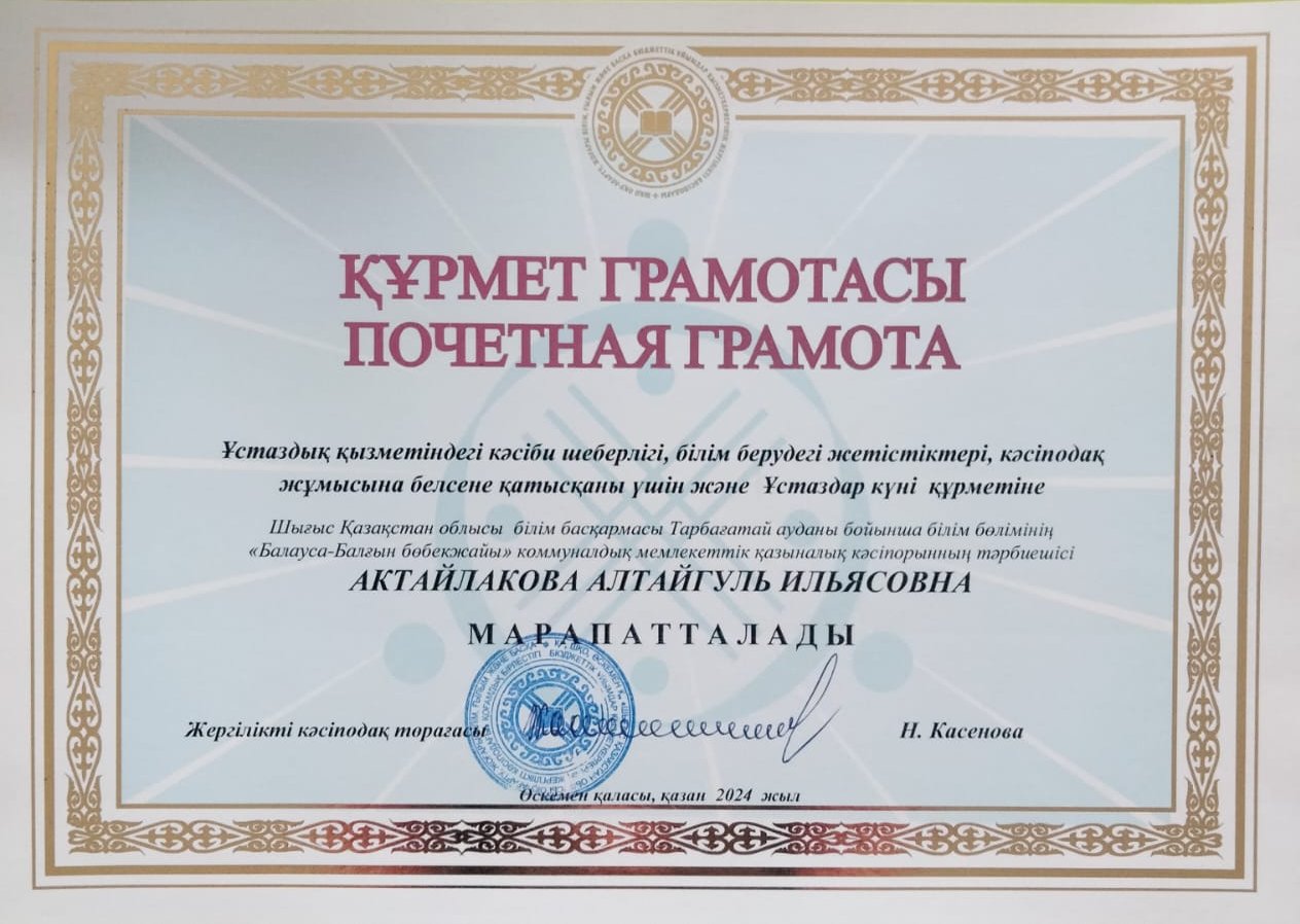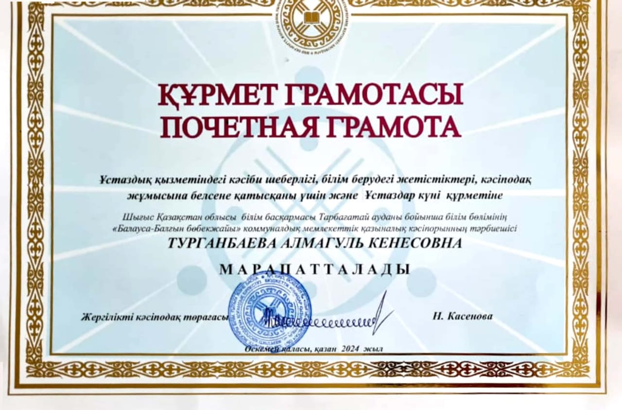 Ұстаздық қызметіндегі кәсіби шеберлігі, білім беруегі жетістіктері, кәсіподақ жұмысына белсене қатысқаны үшін КМҚК «Балауса-Балғын» бөбекжайы» педагогтары А.Турганбаева, А.Ляшова, А.Жумагулова, А.Байсолтанова, А.Актайлакова облыстық кәсіподақ төрағасы Н.Касенованың құрмет грамотасымен марапатталды.