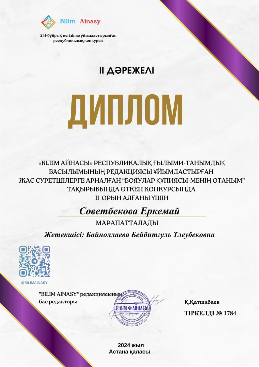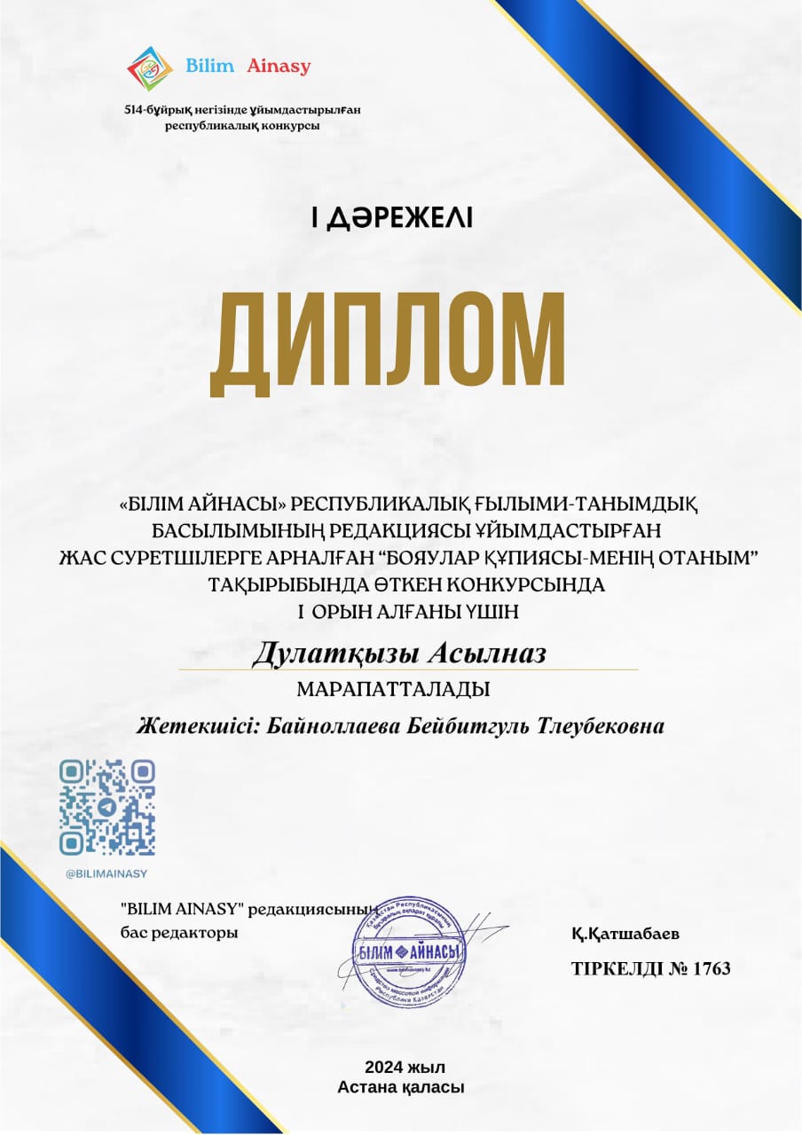 «Білім айнасы» Республикалық ғылыми-танымдық басылымының редакциясы ұйымдастырған жас суретшілерге арналған «Бояулар құпиясы-Менің Отаным» тақырыбында өткен конкурсында КМҚК «Балауса-Балғын» бөбекжайының «Шуақ» ортаңғы тобының тәрбиеленушілері Дулатқызы Асылназ І орын, Советбекова Еркемай ІІ орын, Нұржанұлы Абдуррахим ІІІ орын иеленіп «Білім айнасы» редакциясының бас редакторы Қ.Қатшабаеваның дипломымен марапатталды.