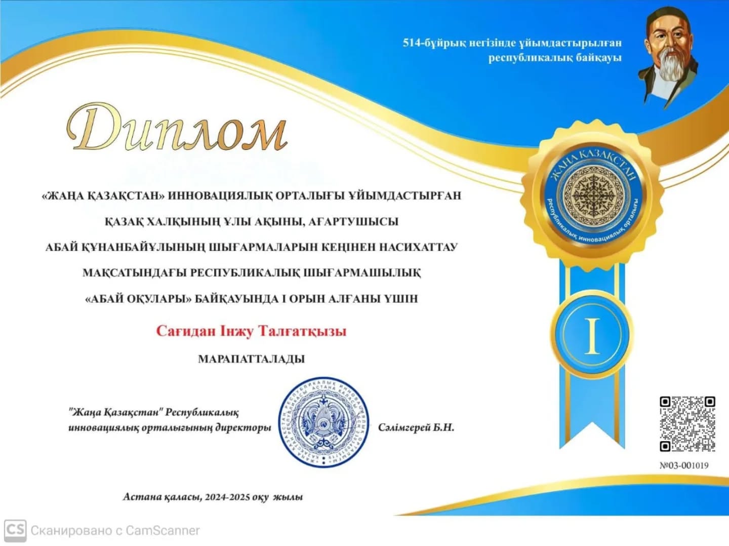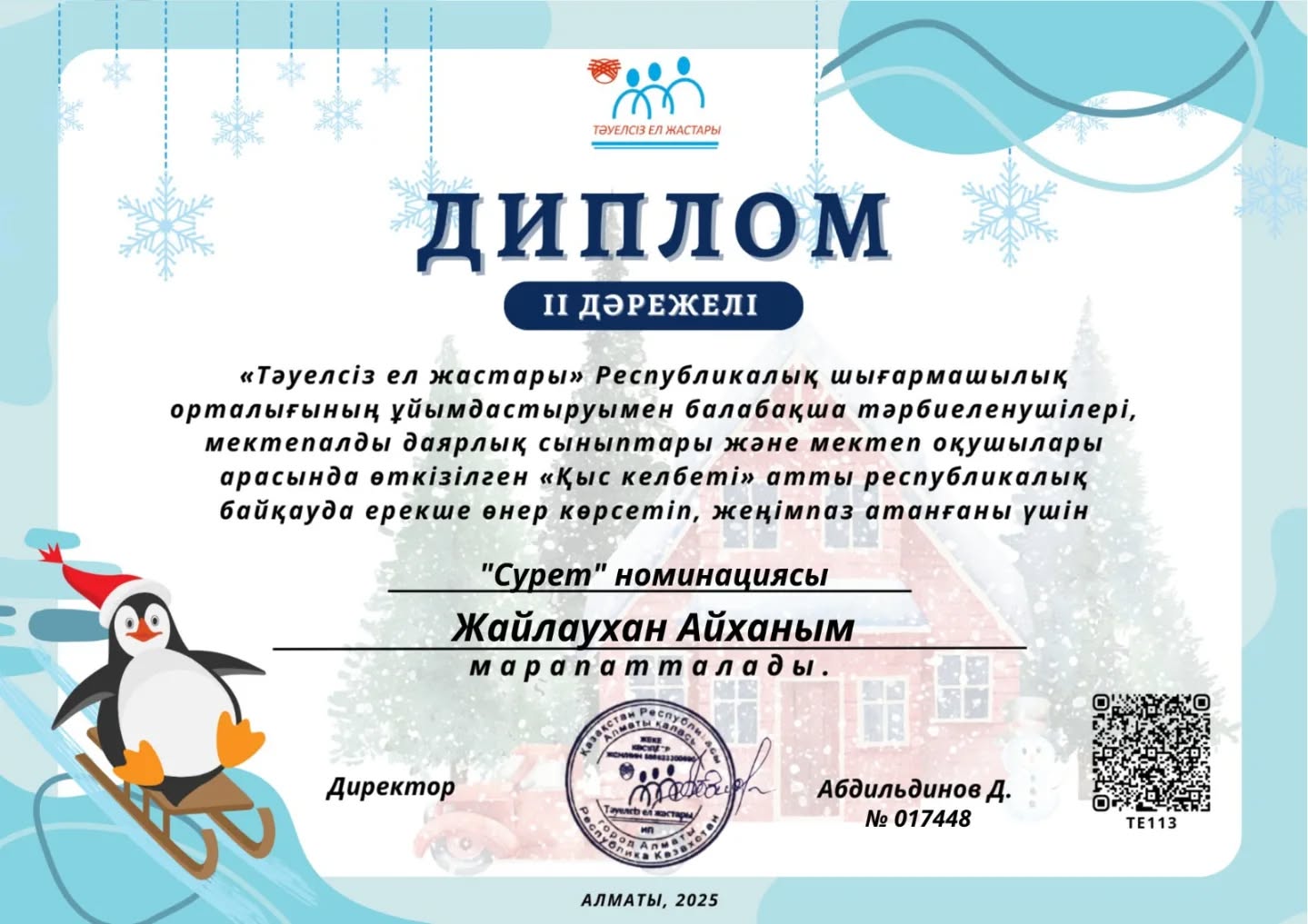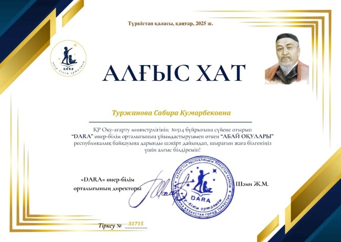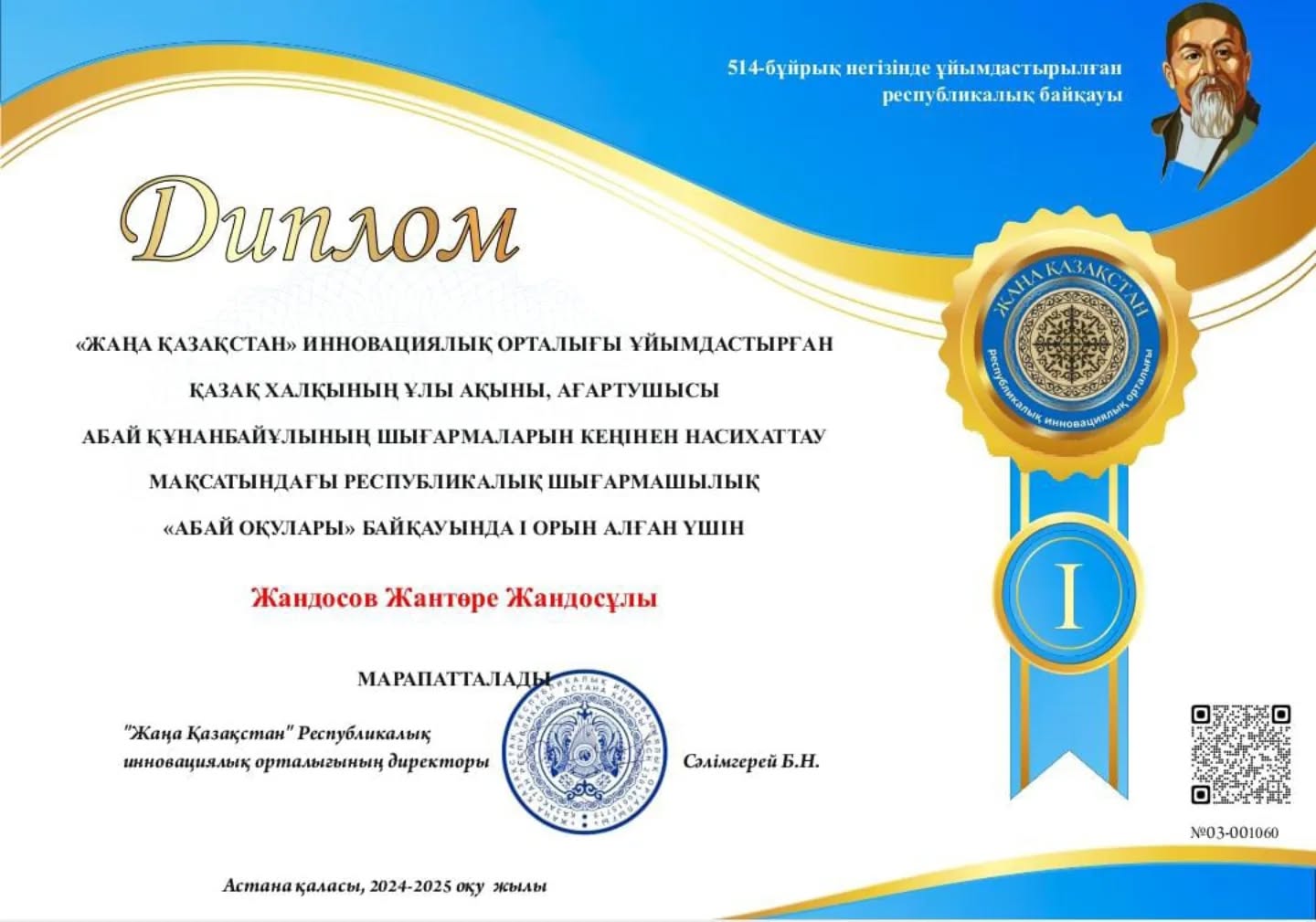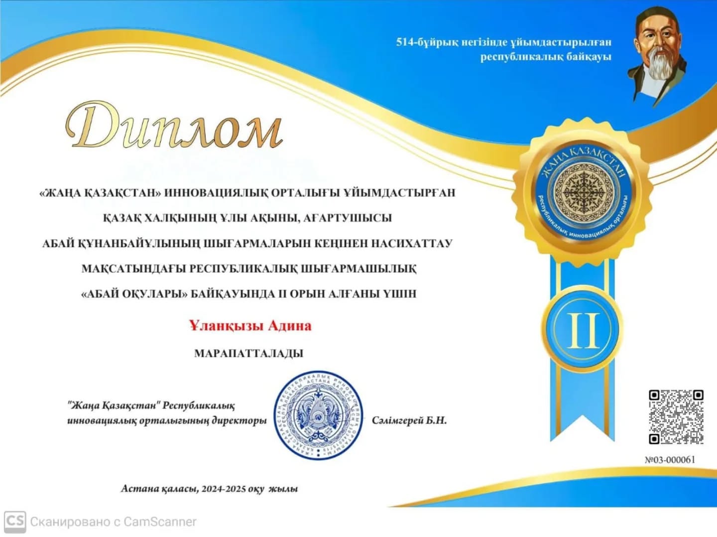 Қабдылқалық Әміре ІІ орын, Ұланқызы Адина ІІ орын, Әлиұлы Мұхаммед І орын, Сағидан Інжу І орын, Жұмағалиев Ертөре ІІ орын, Ниязбекова Жанайым ІІІ орын, Серік Әмір ІІ орын орындар иеленді.