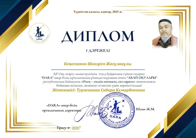 КМҚК "Балауса - Балғын" бөбекжайының тәрбиеленушісі Кеңесханов Шәкәрім Жасұланұлы "DARA" өнер - білім орталығының ұйымдастыруымен өткен "Абай оқулары" республикалық байқауына "Өлең - сөздің патшасы, сөз сарасы" номинациясы бойынша қатысып, І дәрежелі дипломмен марапатталды. Жетекшісі С.К.Туржанова