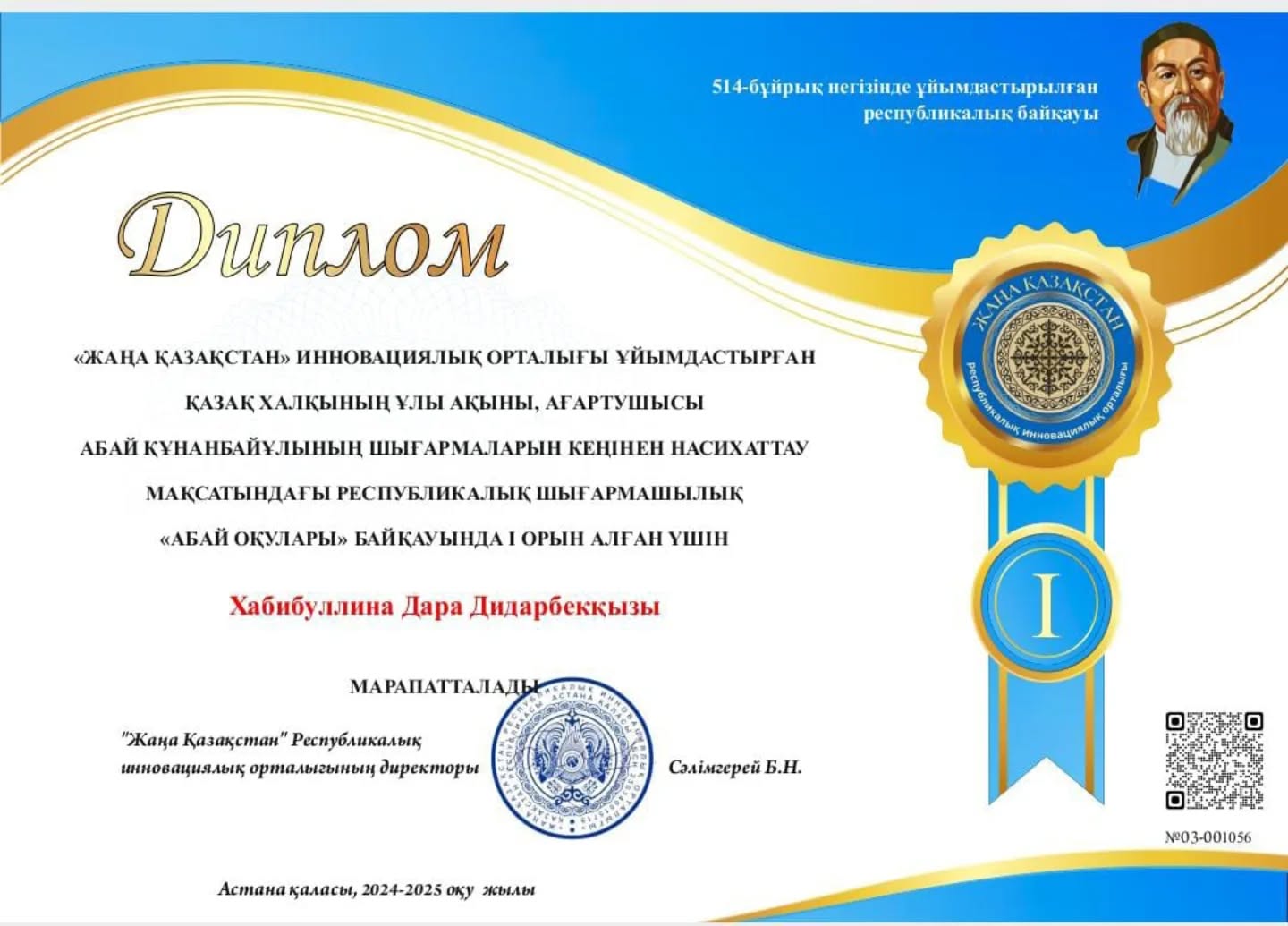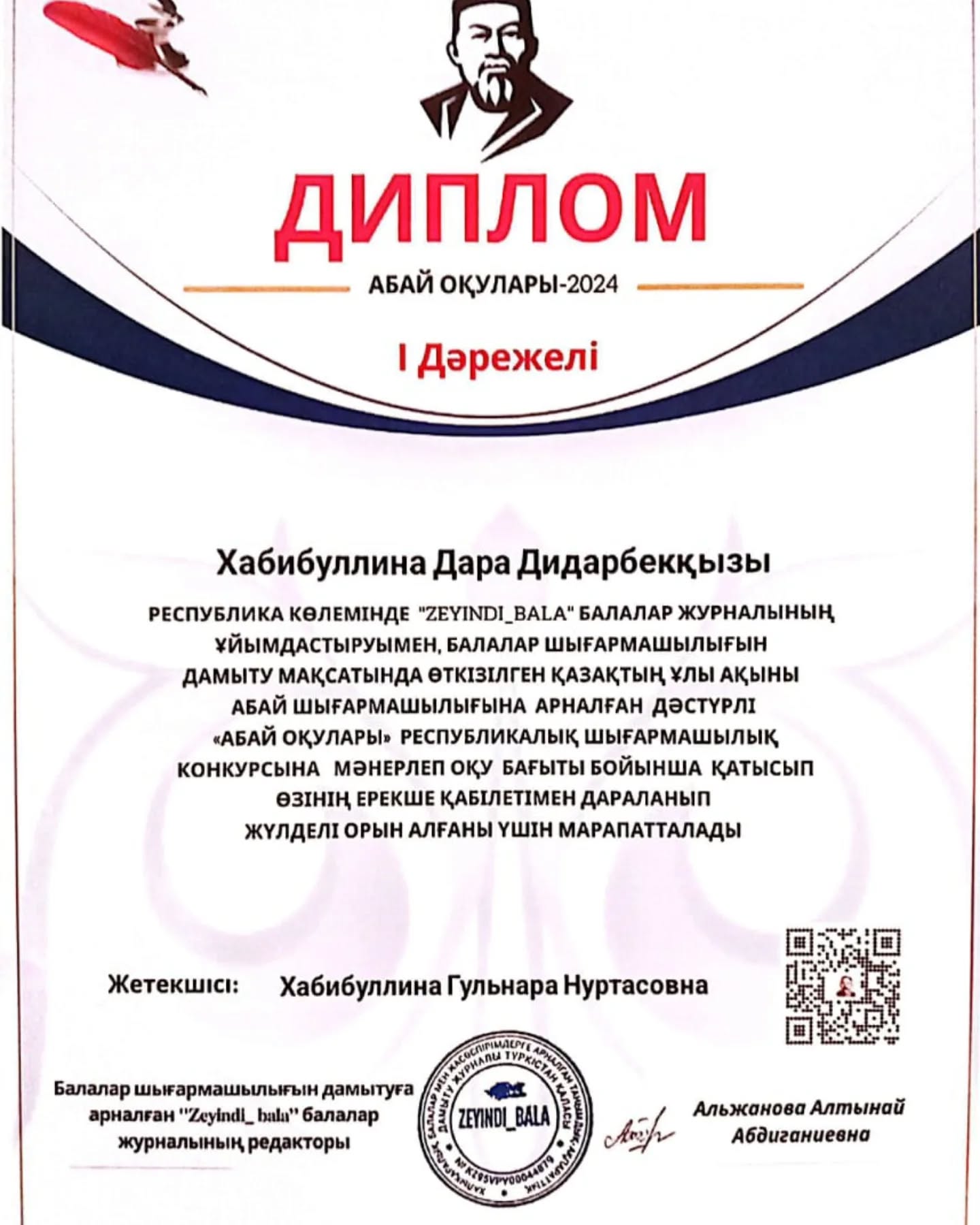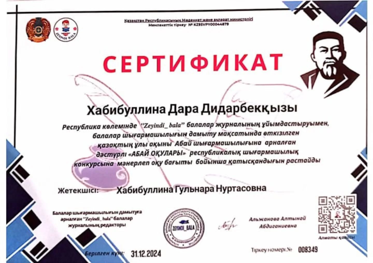 КМҚК "Балауса - Балғын" бөбекжайы "Ақкөгершін" ересек тобының тәрбиеленушісі Хабибуллина Дара Дидарбекқызы Республика көлемінде "Zeindi bala" балалар журналының ұйымдастыруымен өткен дәстүрлі республикалық шығармашылық "Абай оқулары" байқауына мәнерлеп оқу бағыты бойынша қатысып, І дәрежелі дипломмен марапатталды. Жетекшісі Г.Н.Хабибуллина.