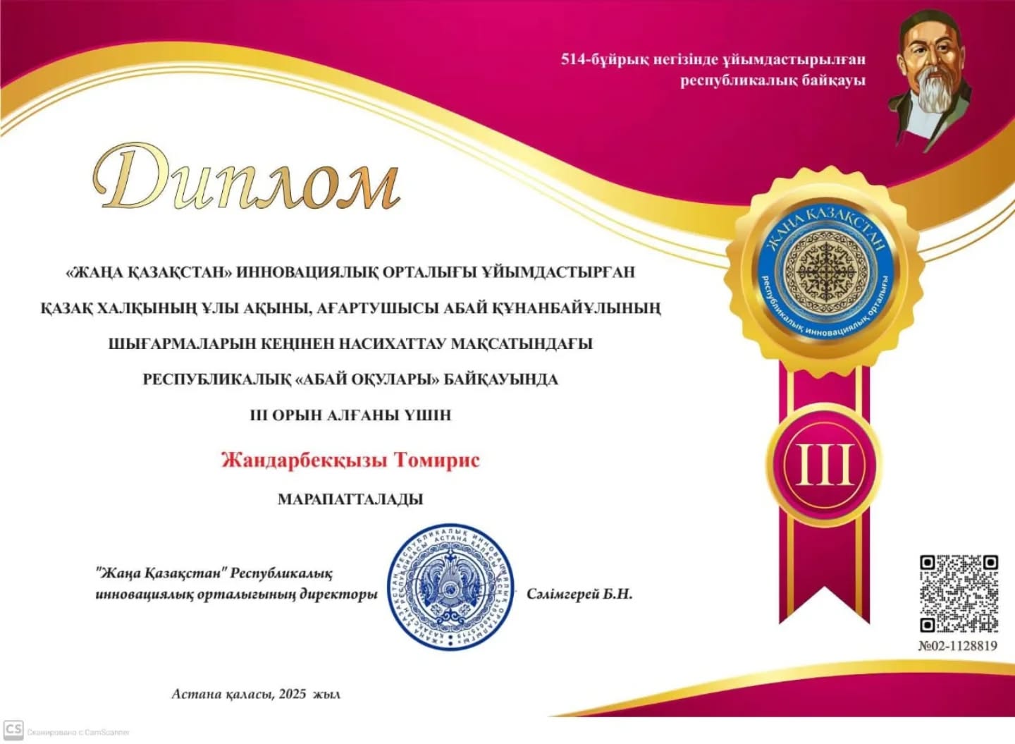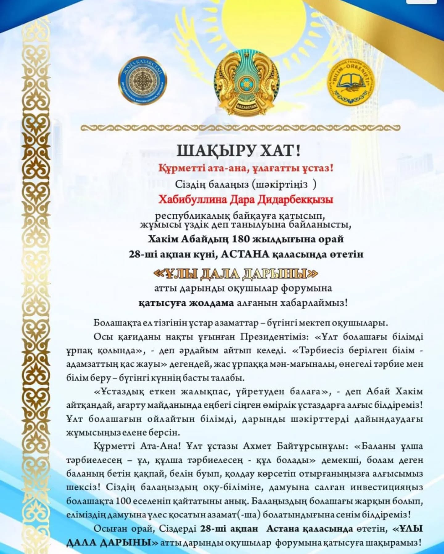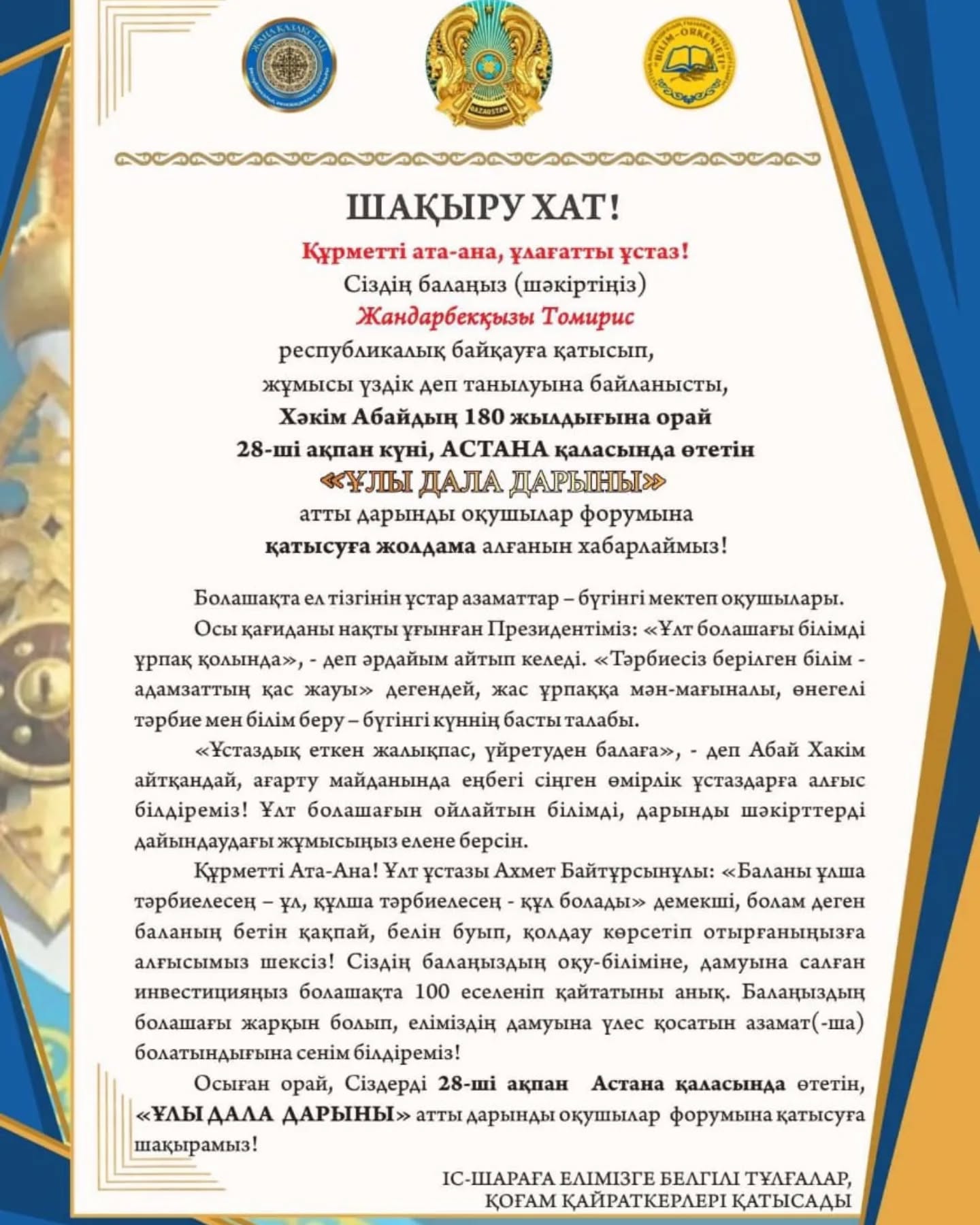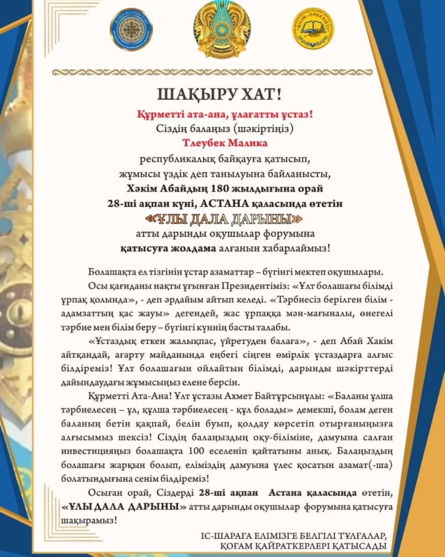 Балабақшамыздың "Балақан" ортаңғы тобының тәрбиеленушілері Тлеубек Малика, Оралхан Ханкелді, Жандарбекқызы Томирис Республикалық "Абай оқулары" байқауында жүлделі орындар иеленіп, 28.02.2025 ж Астана қаласында өтетін "Ұлы дала дарыны" атты дарынды балалар форумына шақыру хат алды.