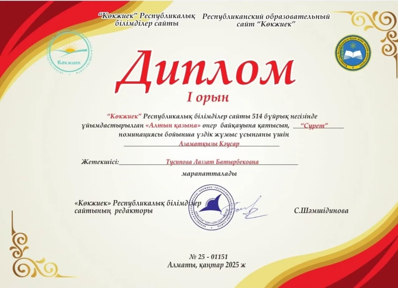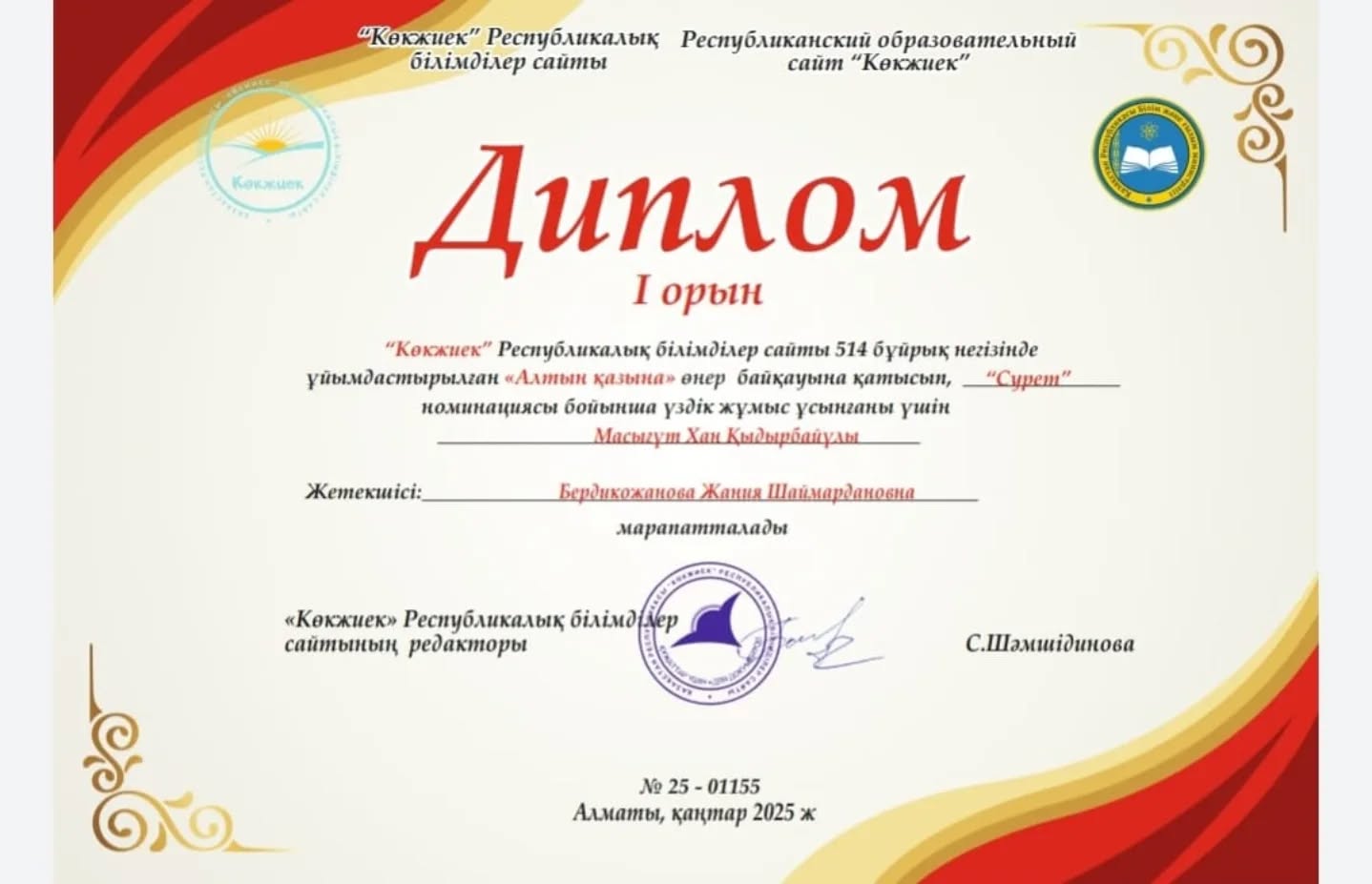 "Қарлығаш" кіші тобының тәрбиеленушілері Масығұт Хан Қыдырбайұлы, Азаматқызы Кәусар Республикалық "Алтын қазына" өнер байқауында сурет номинациясы бойынша І орын иеленді. Жетекшілері: Ж. Ш. Бердикожанова, Л. Т. Тусипова.