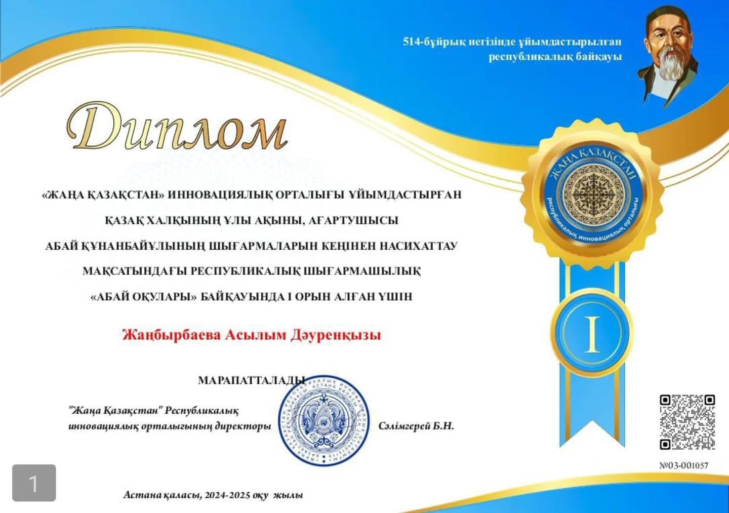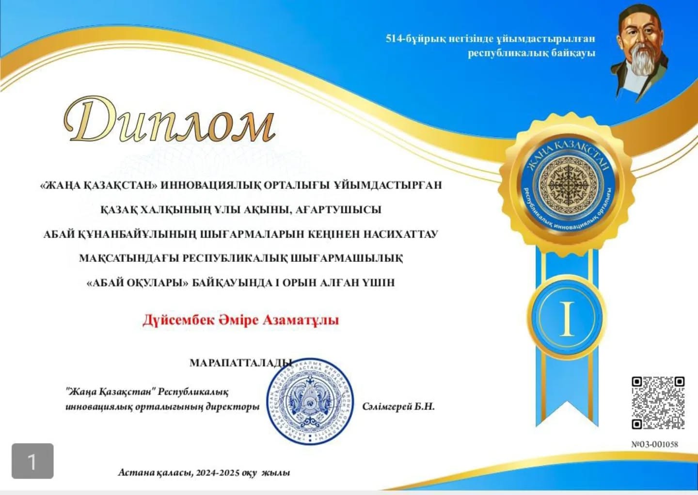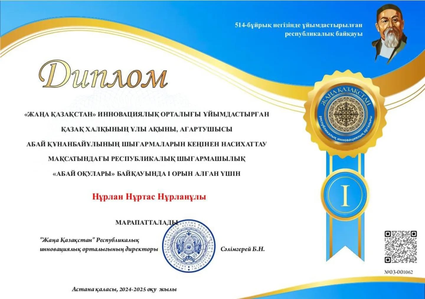 Балабақшамыздың "Ақкөгершін" ересек тобының тәрбиеленушілері Хабибуллина Дара Дидарбекқызы, Жаңбырбаева Асылым Дәуренқызы, Нұрлан Нұртас Нұрланұлы, Төлеухан Кәусар Ермекқызы, Қабдешова Медина Қанатқызы, Жандосов Жантөре Жандосұлы, Дүйсембек Әміре Азаматұлы, Тұрсынбай Еркебол Дәуренұлы республикалық "Абай оқулары" байқауында жүлделі 1-ші орын иеленіп, 28.02.2025 ж Астана қаласында өтетін "Ұлы дала дарыны" атты дарынды балалар форумына шақыру хат алды.