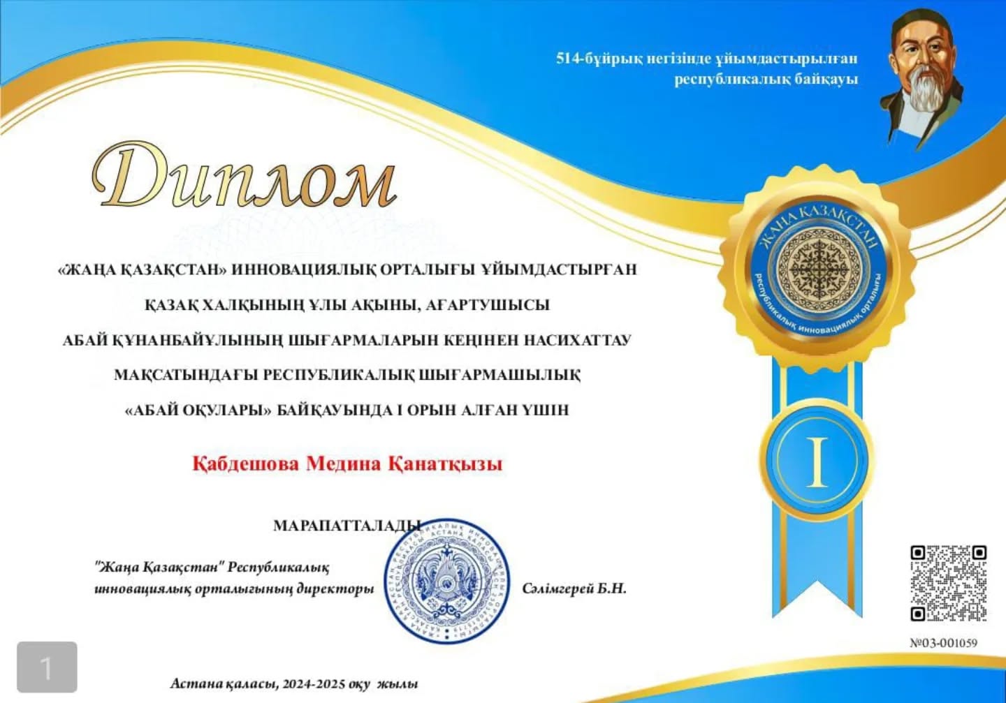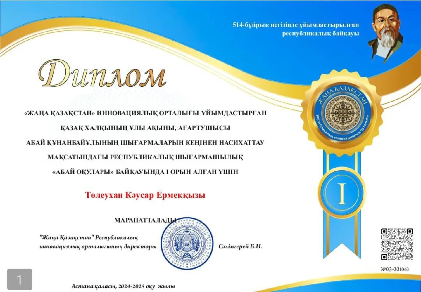 "Жаңа Қазақстан" инновациялық орталығы ұйымдастырған республикалық шығармашылық "Абай оқулары" байқауында КМҚК "Балауса-Балғын" бөбекжайы" "Балбөбек" ересек тобының тәрбиеленушілері